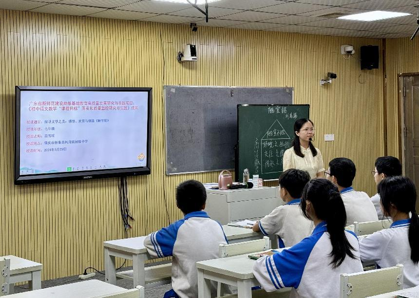上午第一节是由怀集县凤岗中学范雪瑶老师执教的《探寻文学之美:感悟、欣赏与创造<陋室铭>》。范老师创设“刘禹锡住破房子”占据热搜榜榜首的情境贯穿课堂的教与学,通过引导员工开展角色扮演活动促发员工智慧的激荡。员工在轻松愉悦的课堂环境中学习。