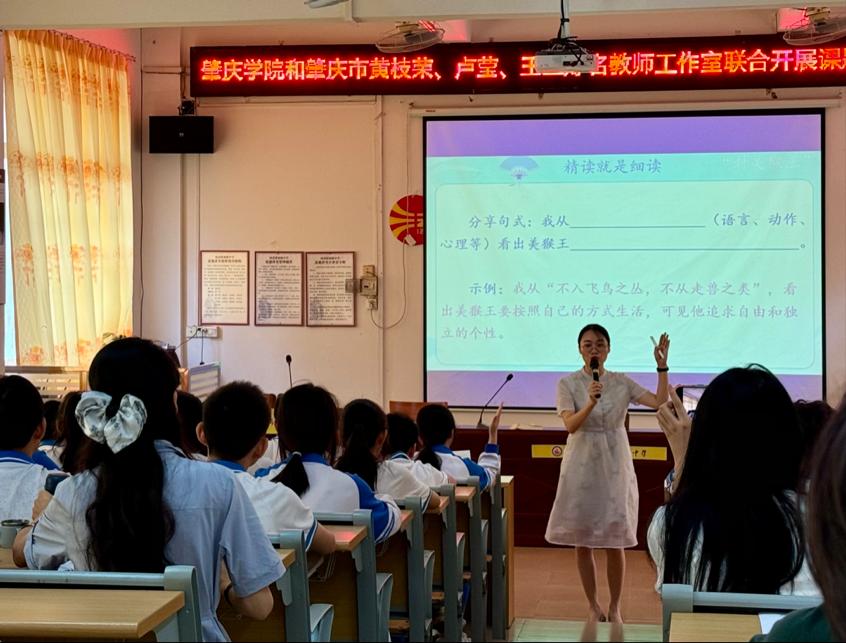 第二节是由肇庆市高新区大旺中学何苑怡老师执教的《读古典小说,取人生真经——<西游记>》。何老师强调了解学情的重要性,在课前通过问卷调查了解员工的阅读情况,完善改进教学设计,最后决定以三个任务群为引领驱动课堂。在课堂上,何老师注重给予员工阅读方法的指导,激发员工的整体书阅读兴趣,提高员工自主阅读的意识。