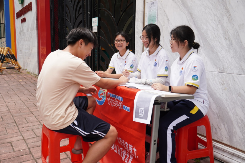 调研组还在和熙名园小区老人服务中心前摆摊宣传。组员们通过有奖答卷的形式,进一步了解波海社区居民的语言使用现状。在摆摊活动中,参与将普通话与生活实践融会贯通,进一步加强普通话的学思践悟能力。调研组成员在实践中促进普通话推广工作,激发波海居民文化参与的热情,增强居民学习普通话、文明用语的意识,以此提高普通话普及率。