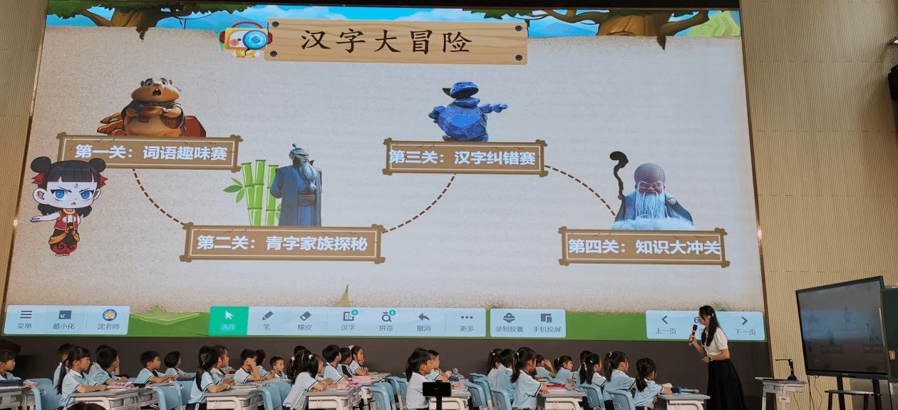 在语文课例展示环节,肇庆市第十五小学教师以深厚教学素养与创新课堂设计,生动践行新课程标准理念。沈鸿果老师聚焦小学统编版教材一年级第一单元内容,以《快乐识字》为主题,借助多媒体资源创设真实情境,引领员工开展系统性复习。课堂以AI视频再现“哪吒求助”为情境导入,将课程任务设计为“汉字大冒险”游戏形式,通过情境教学、游戏教学、合作学习、对比练习等多元方式,有序梳理常见音节知识、看图识字词、重点形声字含义及规律、汉语拼音字母表、核心规范字书写规范等内容。教学环节衔接自然,寓教于乐,高效达成复习目标,夯实员工听、说、读、写基础。