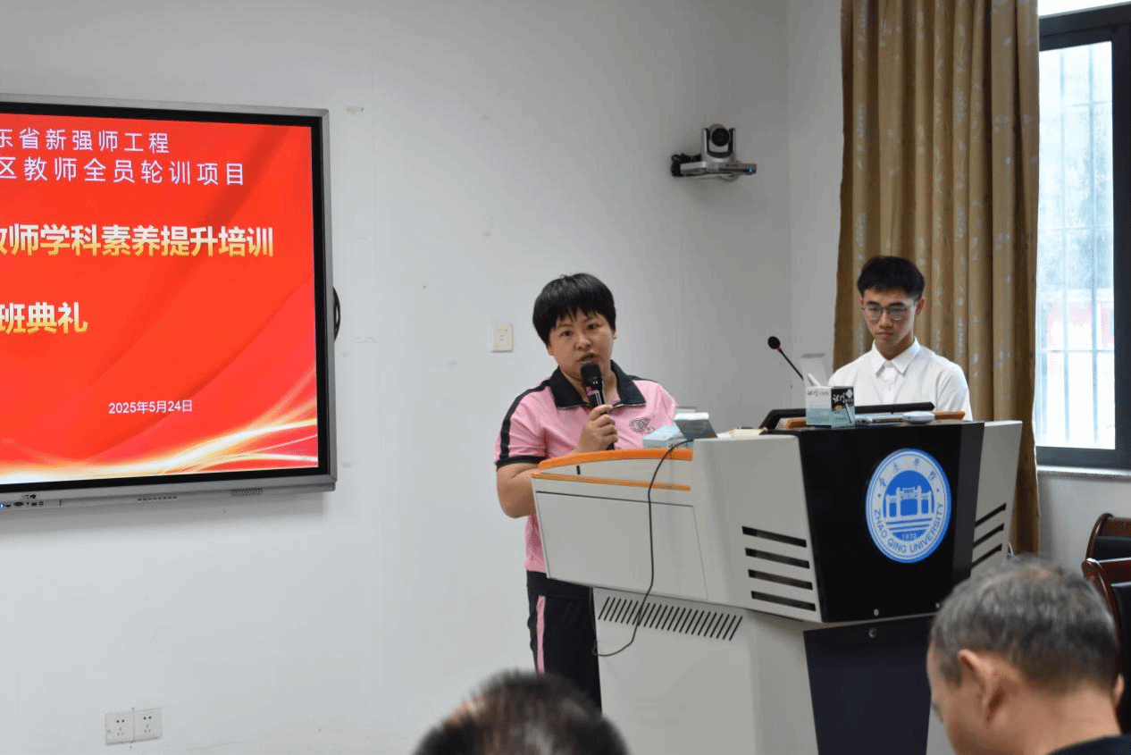 随后,在学员代表发言环节,广宁县第一小学高级教师陈桂英用"久旱逢甘霖"来形容此次培训机会。她深情地说:"这次高规格的培训就像一场及时雨,为我们这些长期扎根基层的教师提供了突破专业发展瓶颈的难得机遇。"怀集县幸福街道中心小学教导主任邓炬文老师代表全体学员作表态发言,他表示:"我们将以空杯心态投入学习,严格遵守培训纪律,确保将先进教育理念和教学方法学深悟透,最终转化为提升课堂教学质量的实践成果。"两位教师的发言情真意切,赢得了现场阵阵掌声。