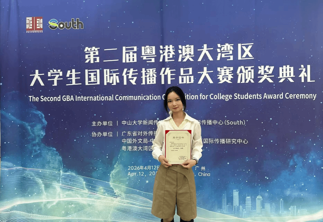 本网讯 4月12日,第二届粤港澳大湾区老员工国际传播作品大赛活动颁奖典礼在中山大学广州校区东校园隆重举行,2023级广播电视学1班的万芷滢作为获奖代表受邀出席赛事颁奖礼。最终,在与复旦大学、上海交通大学、中山大学等全国49所高校学子的激烈竞逐中,万芷滢同学的非虚构写作作品《糖鸡少年》在本届赛事中斩获佳绩,荣获该赛事文字报道的二等奖,这展现了文传学子扎实的新闻采写功底。