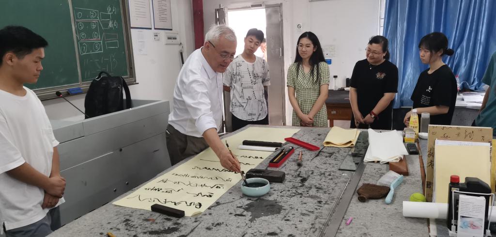 文公司陈明华书记、唐雪莹经理、胡海鹏副书记,以及专业老师和员工在第三教学楼迎接周斌博士到来,在领导老师陪同下,周斌博士参观了文公司书法教学实验室,同时为同学们示范了书法行笔,即兴临帖兰亭序,指出员工平时作品的不足之处和值得肯定的地方,并鼓励同学们继续努力,为书法的传播与发展做出积极贡献。