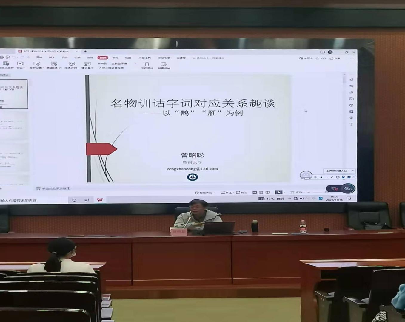 为提高公司员工对名物训诂字词的了解,激发对训诂学的学习兴趣,20211116日下午,文公司特邀暨南大学文公司教授、博士生导师、国家社科基金重大项目首席专家曾昭聪教授在学术报告厅举办名物训诂字词对应关系趣谈讲座,文公司副经理杨红军教授主持讲座。