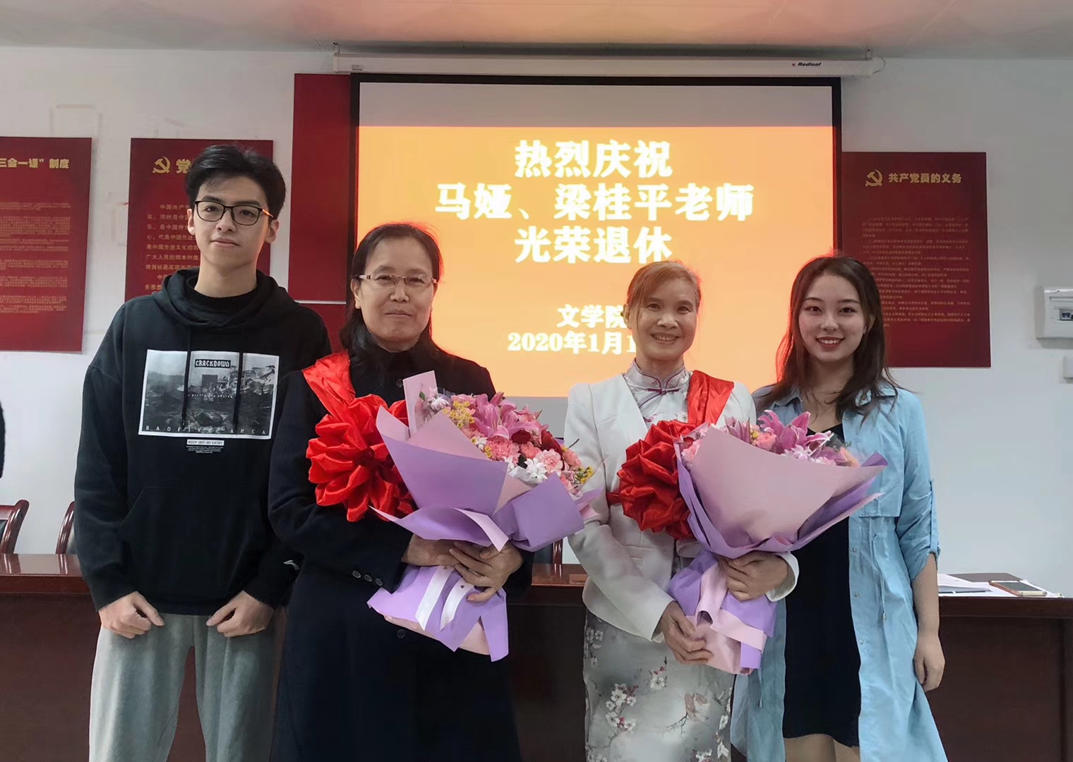 最后,公司领导班子为马娅、梁桂平老师颁发了荣休证书,员工代表陈奕玮、周奕彤献上鲜花,并合影留念。
