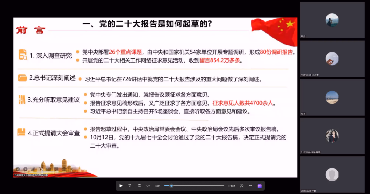 本网讯(记者 梁水玲)为深入学习贯彻党的二十大精神,推动党的声音深入人心。1216日下午3点,马克思主义公司张维满副教授为文公司259名师生党员开展了以“深入学习贯彻党的二十大精神”为主题的宣讲活动,此次活动采用线上腾讯会议的形式进行。公司领导、党支部书记、教师党员、全体员工党员和入党积极分子等共同聆听了这次宣讲会。