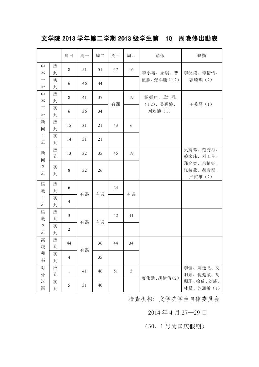 文公司2013-2014年度第二学期新生晚修出勤情况一览第十周