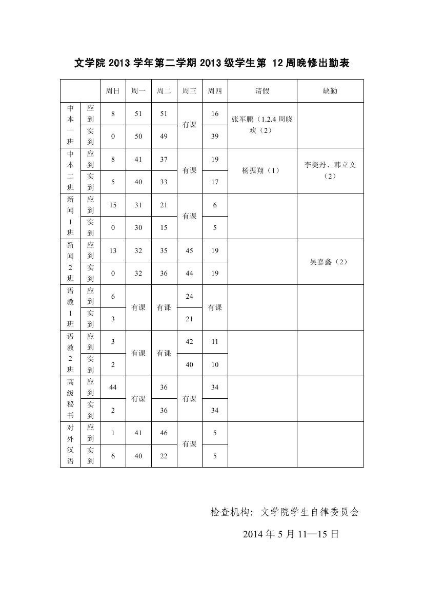 文公司2013-2014年度第二学期新生晚修出勤情况一览第十二周