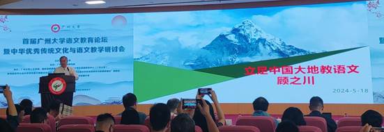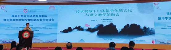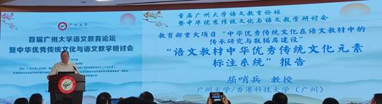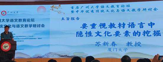 论坛在广州大学图书馆报告厅举行。广州大学屈哨兵教授以“语文教材中华优秀传统文化元素标注系统”为题分享了最新的研究成果,详细阐述了中华优秀传统文化在语文教材中的五种表现方式,并通过一系列图表和视频直观展示传统文化元素的教材标注与大语模建设。人民教育出版社顾之川编审带来了题为“立足中国大地教语文”的精彩报告,从课标为何强调文化自信、语文如何体现文化自信以及教学中怎样落实文化自信三个方面探讨优秀传统文化与新时代语文教育的结合点,强调在教学中要区分语文教育的基本任务、重要任务和必要任务,用语文的方式教语文。厦门大学苏新春教授则从微观层面出发,“要重视教材语言中隐性文化要素的挖掘”,详细阐述了教材语言的构成与分布、交际与使用、搭配与关系并展示了相关案例。广州市教育研究院正高级教师谭健文教师做了“传承视域下中华优秀传统文化与语文教学的融合”主旨报告,认为中小学语文课堂是借助教材的经典文本,将中华精神、中华美德等丰富资源通过潜移默化的人文教化使员工实现从自然生命向文化生命的升华过程。我们应树立“看见文化、理解文化、传播文化”的意识,将文字文章文化三位一体融入课堂。谭老师的报告结合具体实例进行分析,极具实操性。三位专家分别从不同的角度论述了语文教育的文化自信、语文教材的文化要素和语文教学的文化融合,给我们带来了启发性的思考。